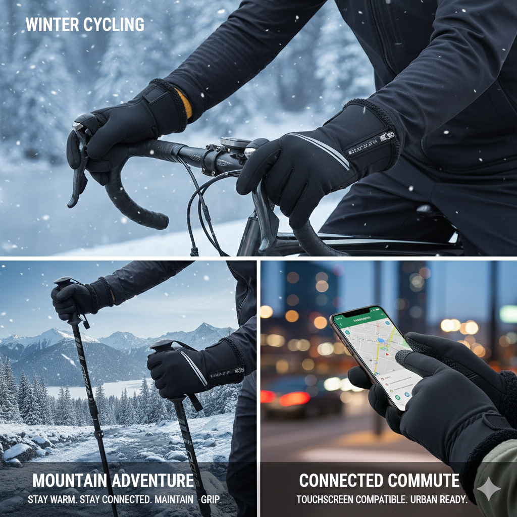 Winter cycling, commuting, yard work, hiking, driving, snow shoveling, and everyday cold-weather use.